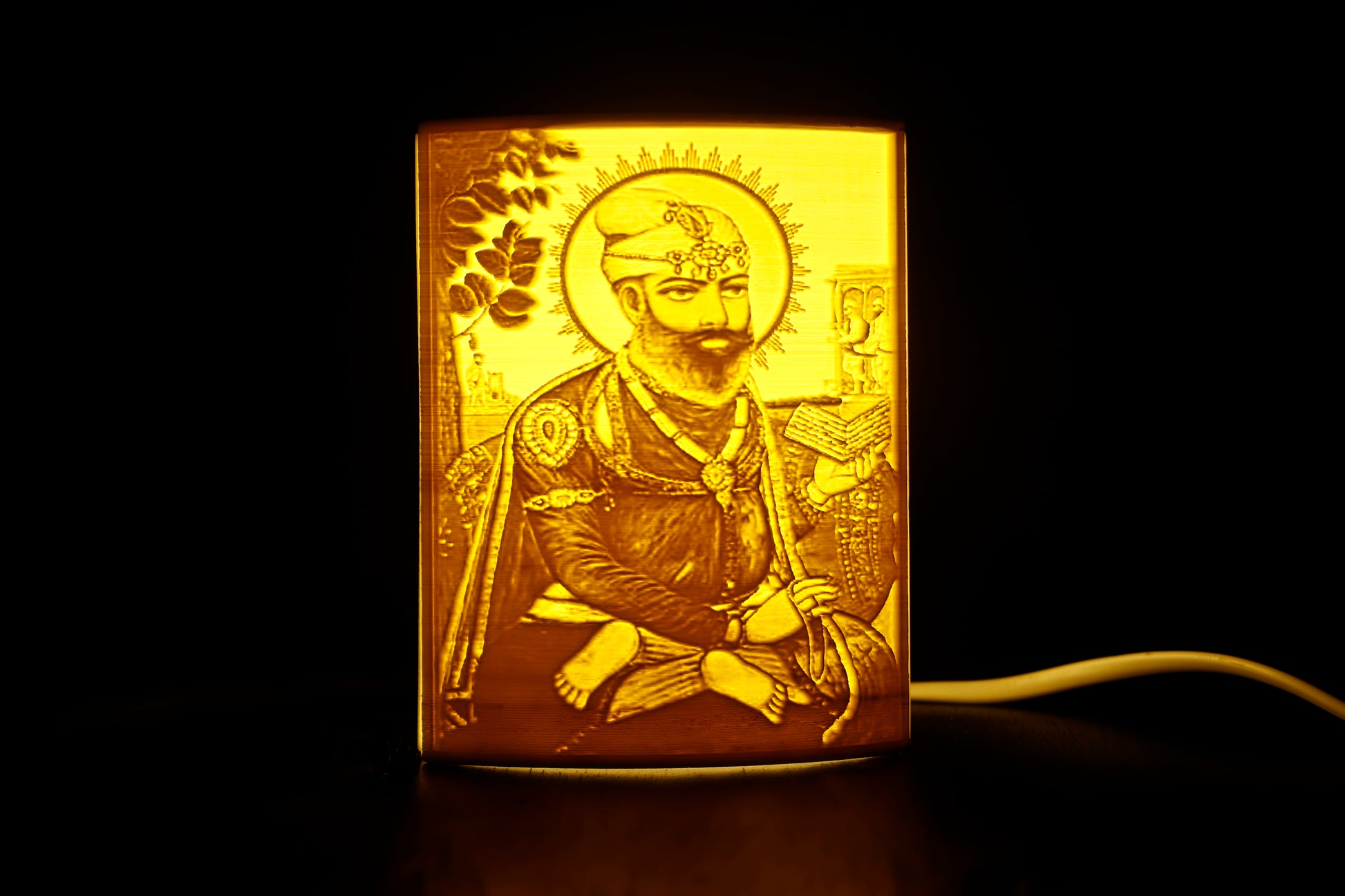 Illuminate your home with the divine presence of Guru Tegh Bahadur Ji through this beautifully crafted lithophane. Made with high-quality translucent material, this 3D-engraved artwork reveals a mesmerizing image of Guru Tegh Bahadur Ji when placed against a light source.